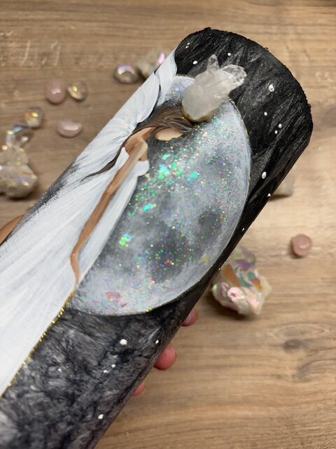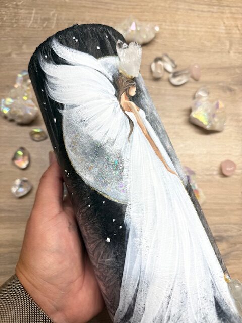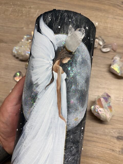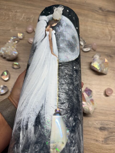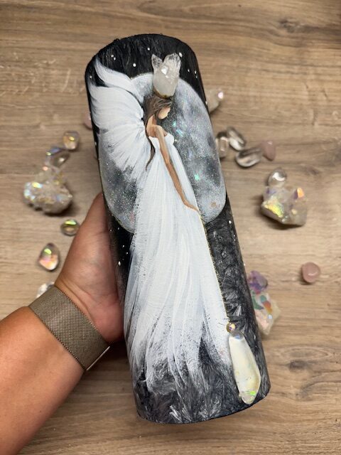 Andělská, ochranná ručně malovaná svíce s křišťály a kameny Swarovski.